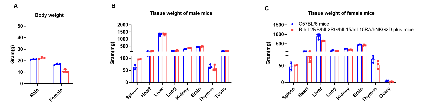 Comparison of body weights and tissues weights between C57BL/6JNifdc mice and B-hIL2RB/hIL2RG/hIL15/hIL15RA/hNKG2D plus mice. There is no significant difference in body weight or the weight of organs such as the spleen between wild-type C57BL/6JNifdc mice and B-hIL2RB/hIL2RG/hIL15/hIL15RA/hNKG2D plus mice.