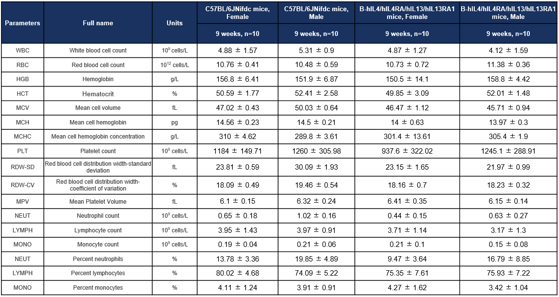 Complete blood count (CBC) of B-hIL4/hIL4R/hIL13/hIL13RA1 mice. Values are expressed as mean ± SD.