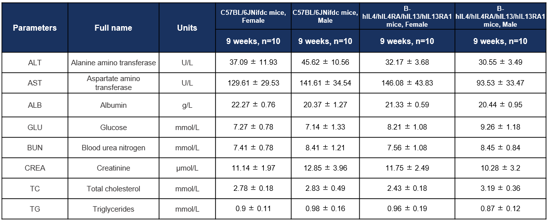Biochemical test of B-hIL4/hIL4R/hIL13/hIL13RA1 mice. Values are expressed as mean ± SD.