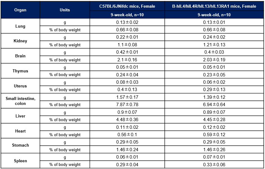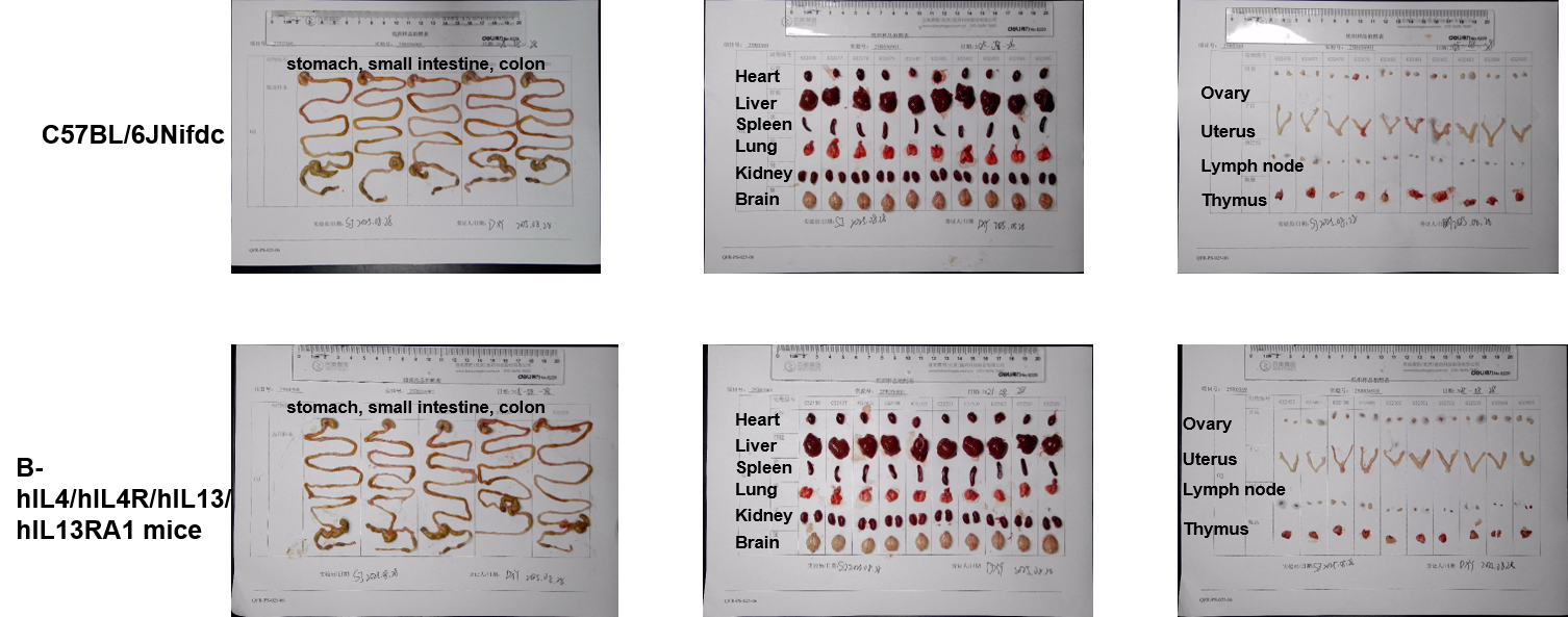 The organs of female C57BL/6JNifdc and B-hIL4/hIL4R/hIL13/hIL13RA1 mice (9-week-old, n=10).