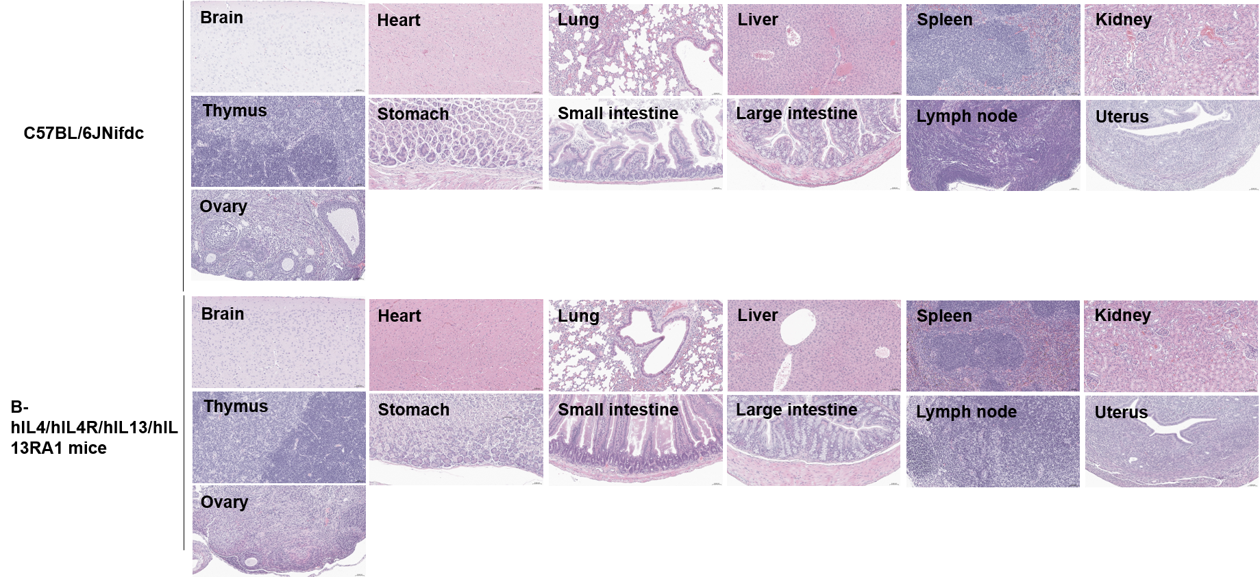 Histopathological analysis of organs in female C57BL/6JNifdc and B-hIL4/hIL4R/hIL13/hIL13RA1 mice. The main organs of C57BL/6JNifdc and B-hIL4/hIL4R/hIL13/hIL13RA1 mice were isolated at 9 weeks of age and analyzed with H&E staining (female, n=3). Results showed that no obvious abnormalities were found in all of the organs (heart, liver, spleen, lung, kidney, brain, stomach, small intestine, large intestine, thymus, lymph nodes, uterus, ovary).