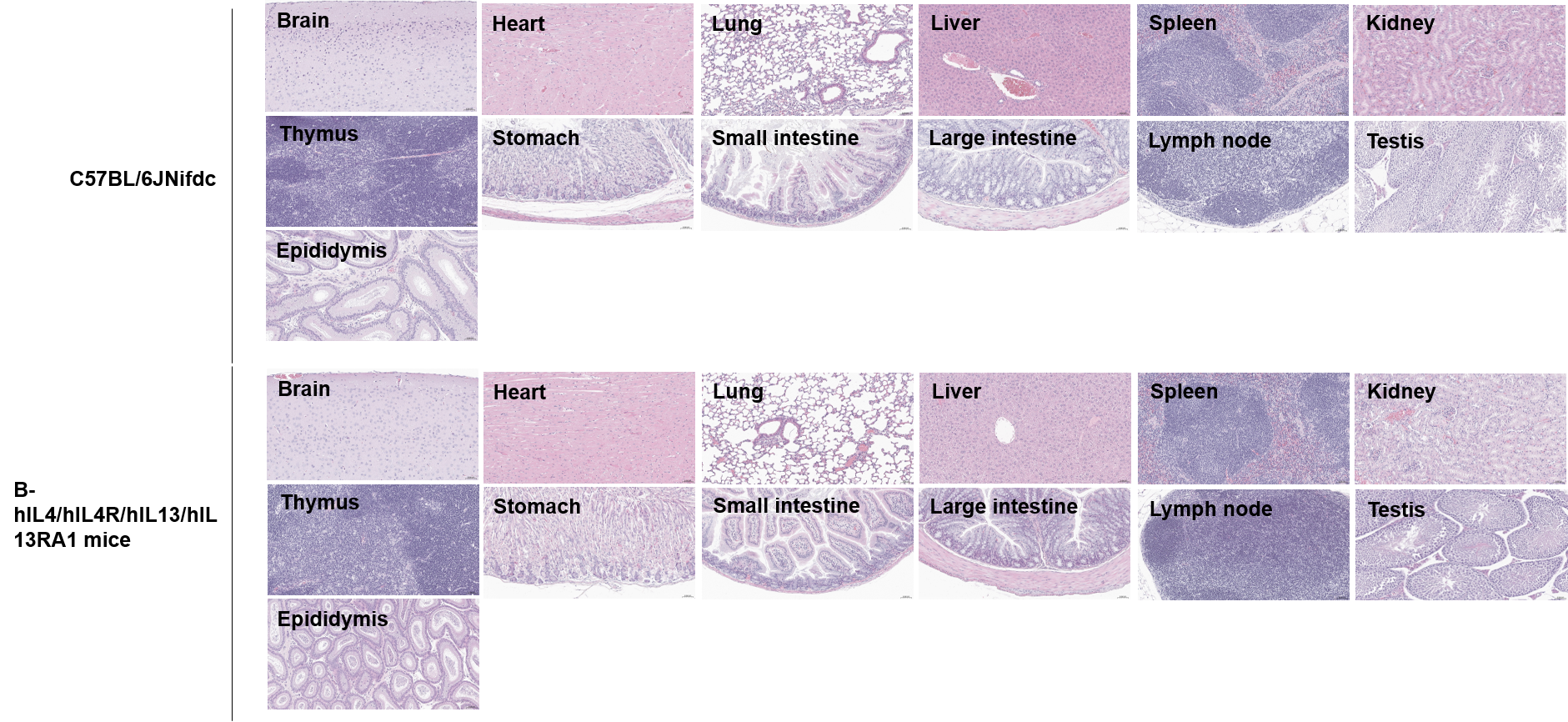 Histopathological analysis of organs in male C57BL/6JNifdc and B-hIL4/hIL4R/hIL13/hIL13RA1 mice. The main organs of C57BL/6JNifdc and B-hIL4/hIL4R/hIL13/hIL13RA1 mice were isolated at 9 weeks of age and analyzed with H&E staining (male, n=3). Results showed that no obvious abnormalities were found in all of the organs (heart, liver, spleen, lung, kidney, brain, stomach, small intestine, large intestine, thymus, lymph nodes, testis, epididymis).