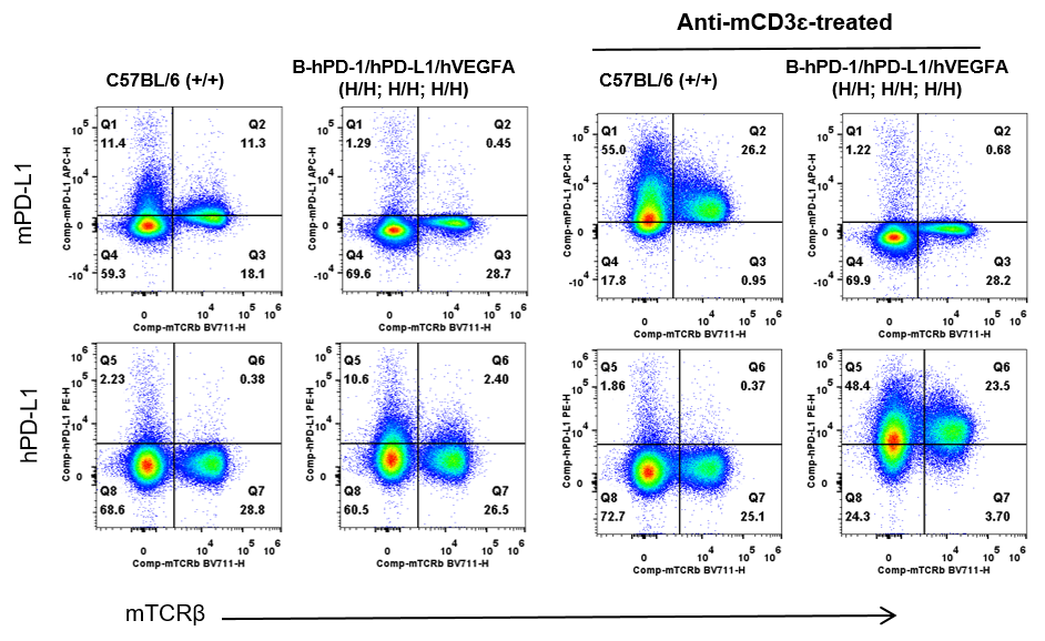 Strain specific PD-L1 expression analysis in wild-type C57BL/6 and homozygous B-hPD-1/hPD-L1/hVEGFA mice by flow cytometry. Splenocytes were collected from wild-type C57BL/6 mice (+/+) and homozygous B-hPD-1/hPD-L1/hVEGFA mice (H/H) after stimulated with anti-mouse CD3ε antibody (7.5 μg, i.p.) in vivo for 24 hrs (female, 6-week-old, n=1) or not. Protein expression was analyzed with anti-mouse PD-L1 antibody (Biolegend, 124312) and anti-human PD-L1 antibody (Biolegend, 329706) by flow cytometry. Mouse PD-L1 were detectable in wild-type C57BL/6 mice. Human PD-L1 were exclusively detectable in homozygous B-hPD-1/hPD-L1/hVEGFA mice but not in wild-type mice.