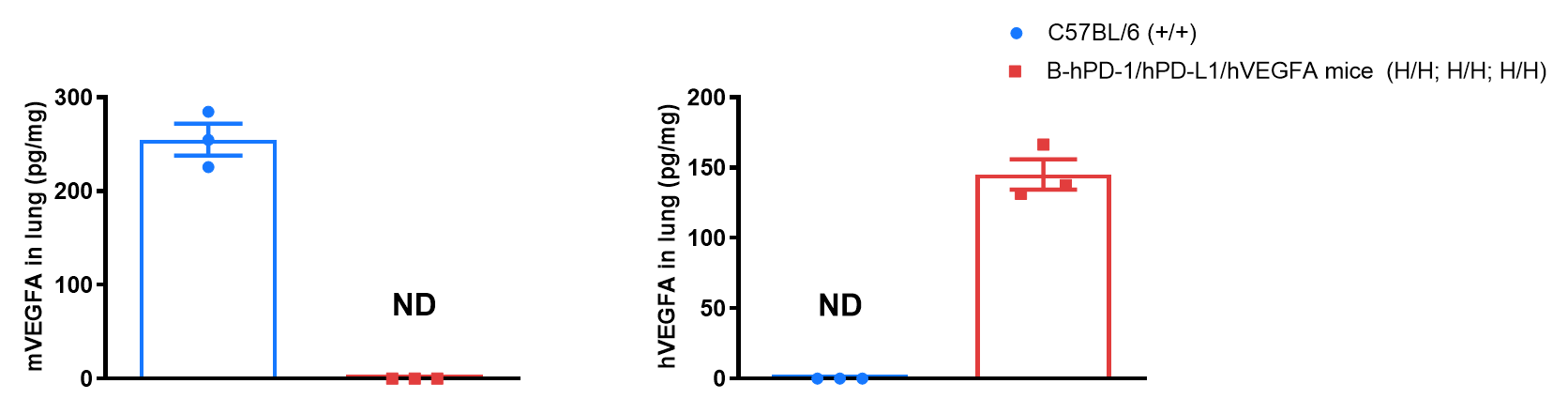 Strain specific VEGFA expression analysis in wild-type C57BL/6 mice and homozygous B-hPD-1/hPD-L1/hVEGFA mice by ELISA. Lung homogenates were collected from wild-type C57BL/6 mice (+/+) and homozygous B-hPD-1/hPD-L1/hVEGFA mice (H/H; H/H; H/H). Expression level of mouse and human VEGFA were analyzed by ELISA (anti-mouse VEGFA antibody: R&D, MMV00; anti-human VEGFA antibody: R&D, DVE00). Mouse VEGFA was detectable in wild-type mice. Human VEGFA was exclusively detectable in homozygous B-hPD-1/hPD-L1/hVEGFA mice but not in wild-type mice.