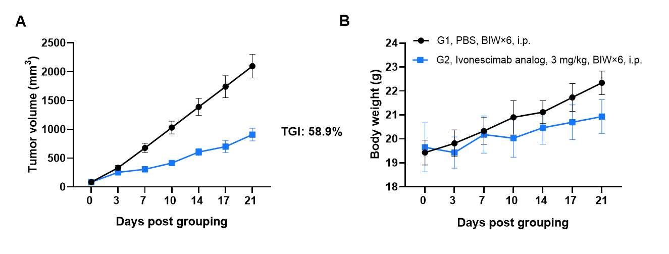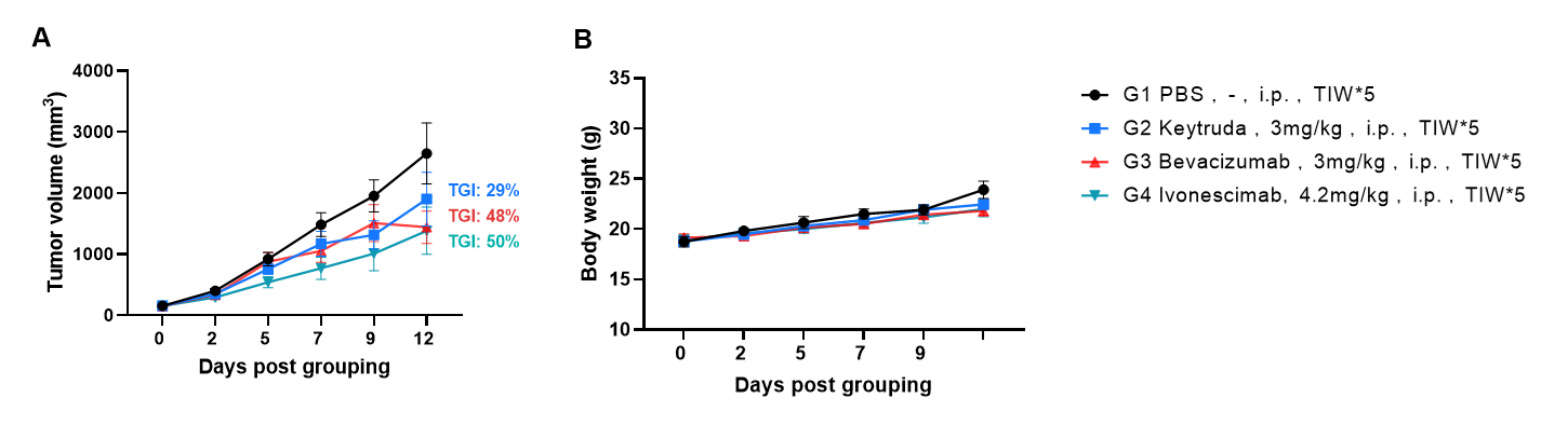 Antitumor activity of Ivonescimab analog (in-house) in B-hPD-1/hPD-L1/hVEGFA mice. Murine colon cancer B-hVEGFA MC38 cells were subcutaneously implanted into homozygous B-hPD-1/hPD-L1/hVEGFA mice (female, 8-week-old, n=6). Mice were grouped when tumor volume reached approximately 70-90 mm3, at which time they were intraperitoneally injected with anti-PD-1/VEGFA bispecific antibody indicated in panel. As shown in panel A, Ivonescimab was efficacious in controlling tumor growth in B-hPD-1/hPD-L1/hVEGFA mice. Values are expressed as mean ± SEM.