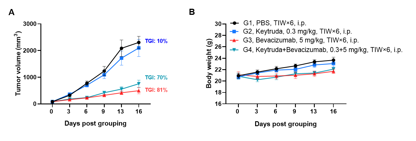 Antitumor activity of bevacizumab and Keytruda (pembrolizumab) was assessed in PD-1/PD-L1/VEGFA humanized mice implanted with murine colon cancer B-hVEGFA MC38 cells (female, 8-week-old, n=6). When tumors reached 70–90 mm³, mice were assigned to treatment groups and intraperitoneally injected with anti-PD-1 and/or anti-VEGFA antibodies. Bevacizumab monotherapy effectively controlled tumor growth in the humanized model. However, the combination of bevacizumab with Keytruda did not yield enhanced efficacy compared to monotherapy.Values are presented as mean ± SEM.
