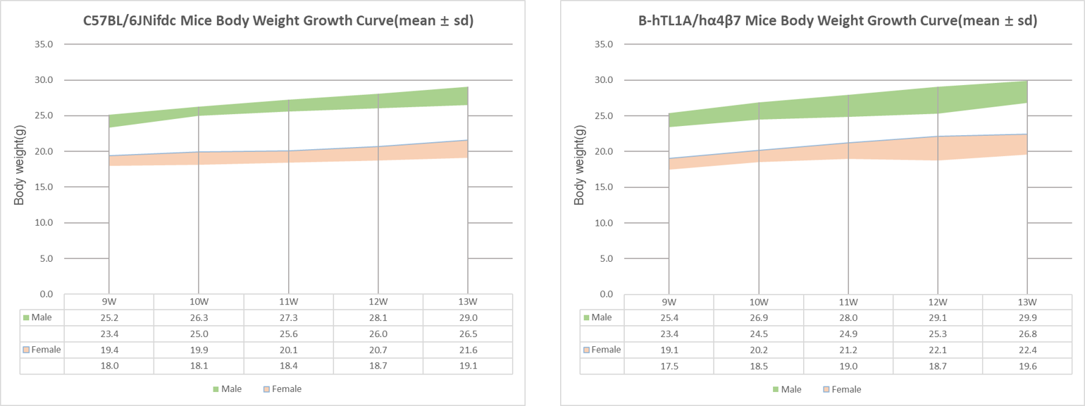 Growth curve of wild-type C57BL/6JNifdc and B-hTL1A/hα4β7 mice. 9-week-old mice were grouped (10 males and 10 females, respectively). Body weight was measured on the same day of every week and lasted for 13 weeks. The lowest and highest values of mouse body weight in the table were calculated from the mean ± SD. The growth curve of the B-hTL1A/hα4β7 mice was similar to the growth curve of C57BL/6JNifdc mice.