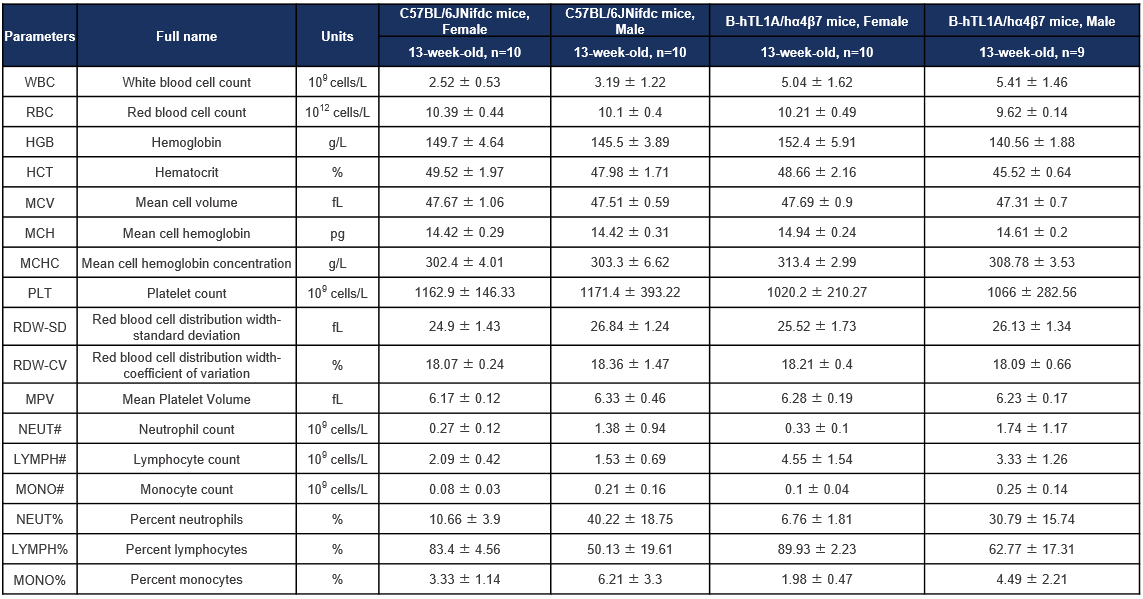 Complete blood count (CBC) of B-hTL1A/hα4β7 mice. Values are expressed as mean ± SD.