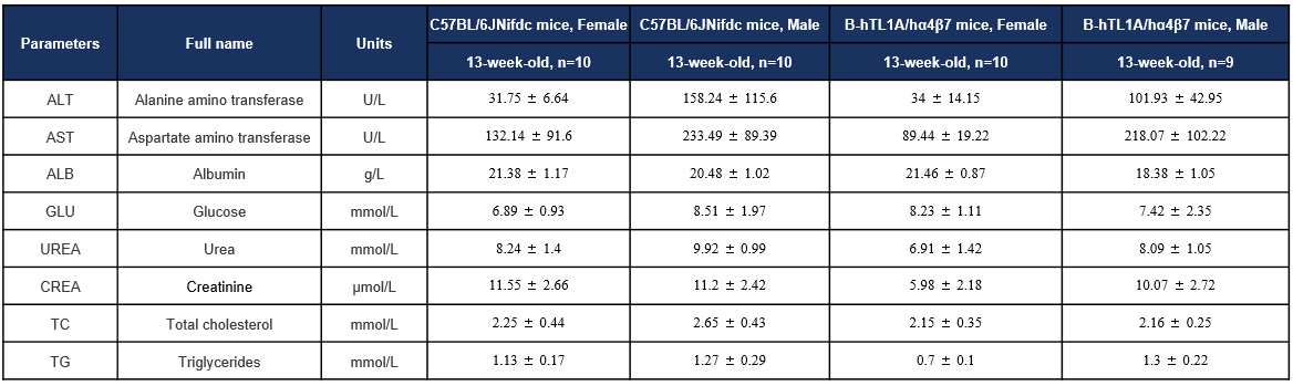 Biochemical test of B-hTL1A/hα4β7 mice. Values are expressed as mean ± SD.