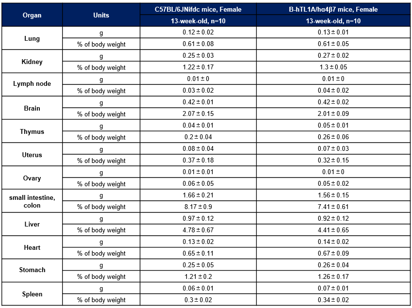 Average weight of the main organs of female C57BL/6 and B-hTL1A/hα4β7 mice.