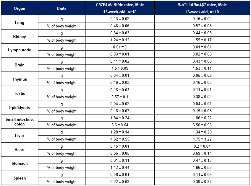 Average weight of the main organs of male C57BL/6 and B-hTL1A/hα4β7 mice.