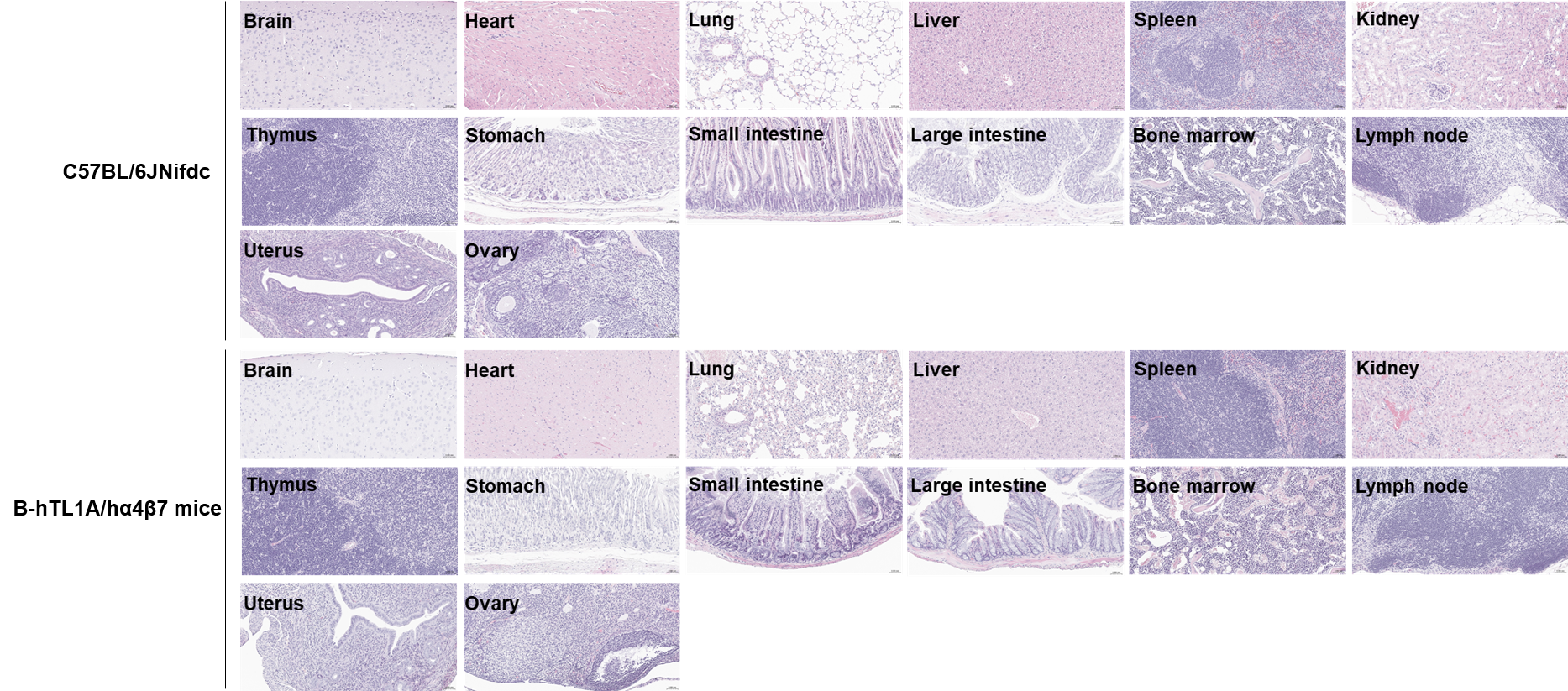 Histopathological analysis of organs in female C57BL/6JNifdc and B-hTL1A/hα4β7 mice. The main organs of C57BL/6JNifdc and B-hTL1A/hα4β7 mice were isolated at 13 weeks of age and analyzed with H&E staining (female, n=3). Results showed that no obvious abnormalities were found in all of the organs (brain, heart, lung, liver, spleen, kidney, thymus, stomach, small intestine, large intestine, bone marrow, lymph node, uterus and ovary).