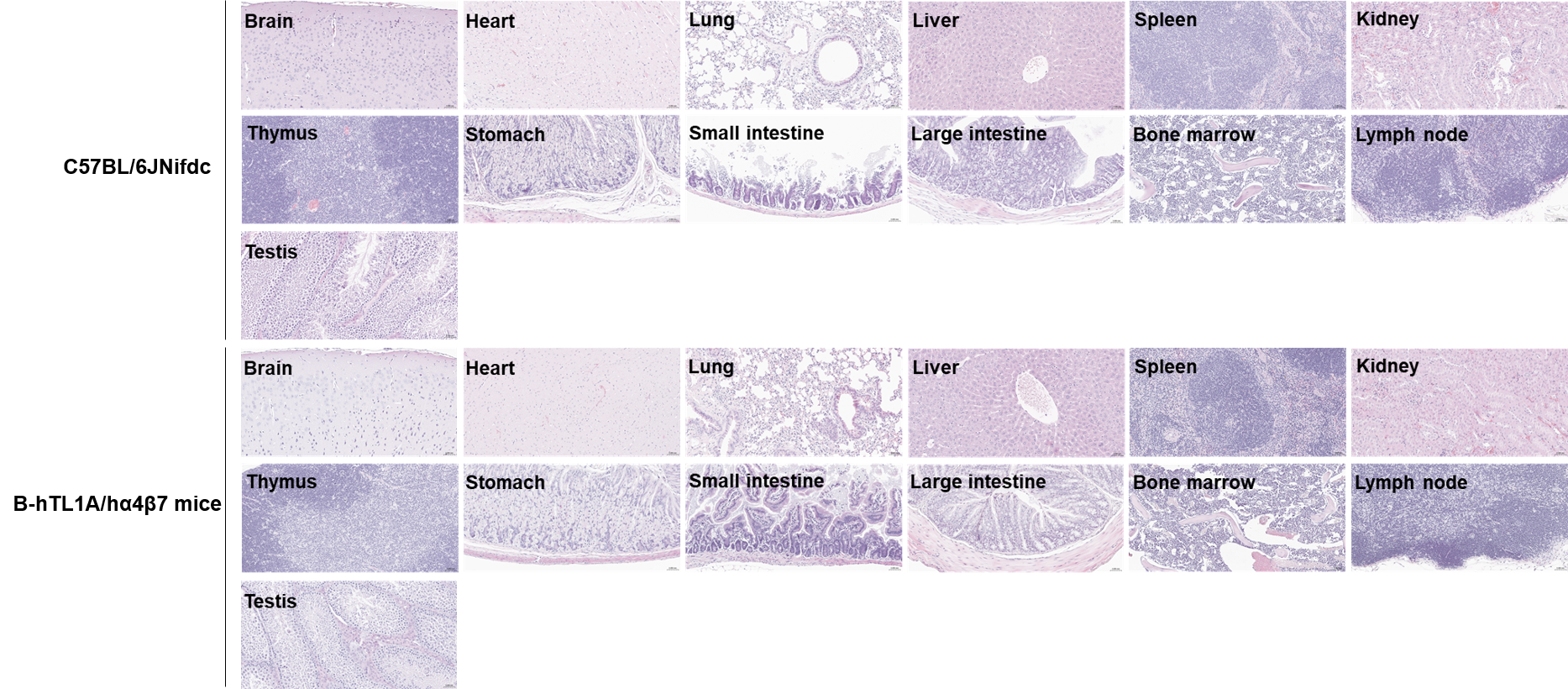 Histopathological analysis of organs in male C57BL/6JNifdc and B-hTL1A/hα4β7 mice. The main organs of C57BL/6JNifdc and B-hTL1A/hα4β7 mice were isolated at 13 weeks of age and analyzed with H&E staining (male, n=3). Results showed that no obvious abnormalities were found in all of the organs (brain, heart, lung, liver, spleen, kidney, thymus, stomach, small intestine, large intestine, bone marrow, lymph node, and testis).