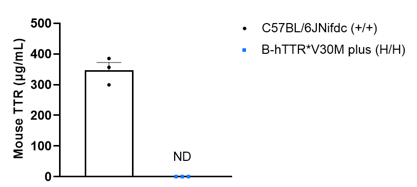 Strain specific TTR expression analysis in homozygous B-hTTR*V30M mice plus by ELISA. Plasma was collected from wild-type C57BL/6JNifdc mice (+/+) (female, 8-week-old, n=3) and homozygous B-hTTR*V30M mice plus (H/H) (female, 7-week-old, n=3), and then analyzed by ELISA with species-specific Prealbumin ELISA kit (abcam, ab282297). Mouse prealbumin (TTR) was only detectable in wild-type C57BL/6JNifdc mice but not in homozygous B-hTTR*V30M mice plus.