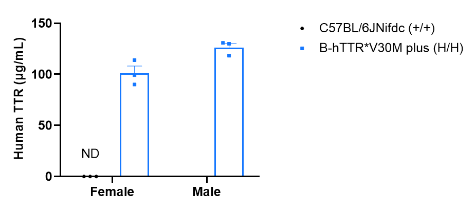 Strain specific hTTR expression analysis in homozygous B-hTTR*V30M mice plus by ELISA. Plasma was collected from wild-type C57BL/6 mice (+/+) (female, 8-week-old, n=3) and homozygous B-hTTR*V30M mice plus (H/H) (female, 7-week-old, n=3; male, 7-week-old, n=3), and then analyzed by ELISA with species-specific Prealbumin ELISA kit (abcam, ab231920). Human prealbumin (TTR) was exclusively detectable in B-hTTR*V30M mice plus but not in wild-type mice.
