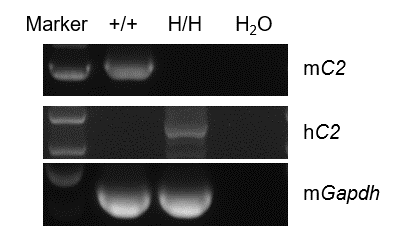 Strain specific analysis of C2 mRNA expression in wild-type C57BL/6JNifdc mice and B-hC2 mice by RT-PCR. Liver RNA were isolated from wild-type C57BL/6JNifdc mice (+/+) and homozygous B-hC2 mice (H/H), then cDNA libraries were synthesized by reverse transcription, followed by PCR with mouse and human C2 primers. Mouse C2 mRNA was only detectable in wild-type mice. Human C2 mRNA was detectable only in homozygous B-hC2 mice but not in wild-type mice.