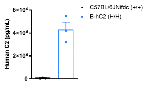 Strain specific C2 expression analysis in wild-type C57BL/6JNifdc mice and homozygous humanized B-hC2 mice by ELISA. Serum was collected from wild-type C57BL/6JNifdc mice (+/+) (male, n=3, 10-week-old) and homozygous B-hC2 mice (H/H) (male, n=3, 10-week-old). Expression level of human C2 were analyzed by ELISA (anti-human C2 ELISA kit: Abcam, ab254501). Human C2 was exclusively detectable in homozygous B-hC2 mice (n=3). Values are expressed as mean ± SEM.