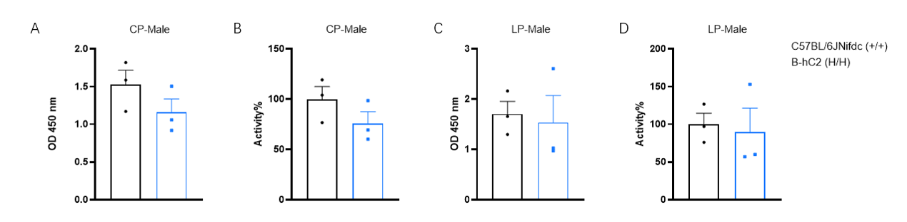 Functional activity of the Complement pathway and Lectin Complement of homozygous B-hC2 mice. Serum was collected from wild-type C57BL/6JNifdc mice (+/+) and homozygous B-hC2 mice (H/H) (male, 10 weeks old, n=3) and evaluate the functional activity with the complement kit (Classical Complement Pathway, Mouse Assay, Hycult Biotech, HIT420; Lectin Complement Pathway, Mouse Assay, Hycult Biotech, HIT421). (A) The OD values at 1:20 serum dilution, assayed using the Classical Complement Pathway Assay Kit. (B) Classical Complement Pathway Activity% compared with male wild-type C57BL/6JNifdc mice. (C) The OD values at 1:20 serum dilution, assayed using the Lectin Complement Pathway Assay Kit. (D) Lectin Complement Pathway Activity% compared with male wild-type C57BL/6JNifdc mice.