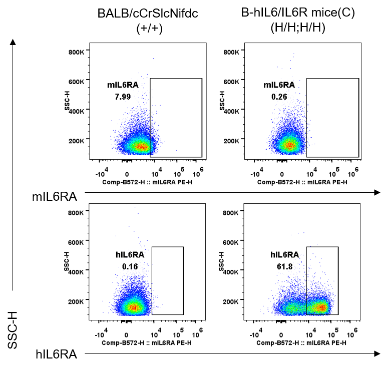 Strain specific IL6R expression analysis in wild-type BALB/cCrSlcNifdc mice and homozygous B-hIL6/IL6R mice(C) by flow cytometry. Splenocytes were collected from wild-type BALB/cCrSlcNifdc mice and homozygous B-hIL6/IL6R mice(C), and analyzed by flow cytometry with species-specific anti-mIL-6Rα Antibody (PE anti-mouse CD126 (IL-6Rα chain) Antibody, biolegend, 115805) and anti-hIL-6Rα Antibody (PE anti-human CD126 (IL-6Rα) Antibody, biolegend, 352803). Mouse IL6R was detectable in T cells of wild-type mice. Human IL6R was detectable in T cells of homozygous B-hIL6/IL6R mice(C).
