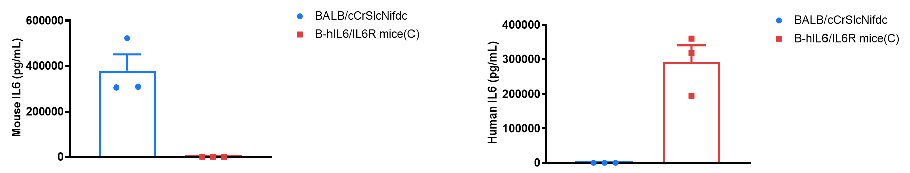 Strain specific IL6 expression analysis in wild-type BALB/cCrSlcNifdc mice and homozygous B-hIL6/IL6R mice(C) by ELISA. Serum was collected from wild-type BALB/cCrSlcNifdc mice (female, n=3), homozygous B-hIL6/IL6R mice(C) (female, n=3), the production of IL6 in serum were assessed after 3 h of stimulation with LPS (20 μg/200uL, i.p.) in vivo. Expression level of mouse and human IL6 were analyzed by ELISA (ELISA MAX™ Deluxe Set Mouse IL-6(431304); ELISA MAX™ Deluxe Set Human IL-6 (430508)). Mouse IL6 was only detectable in wild-type BALB/cCrSlcNifdc mice. Human IL6 was only detectable in homozygous B-hIL6/IL6R mice(C). Values are expressed as mean ± SEM.