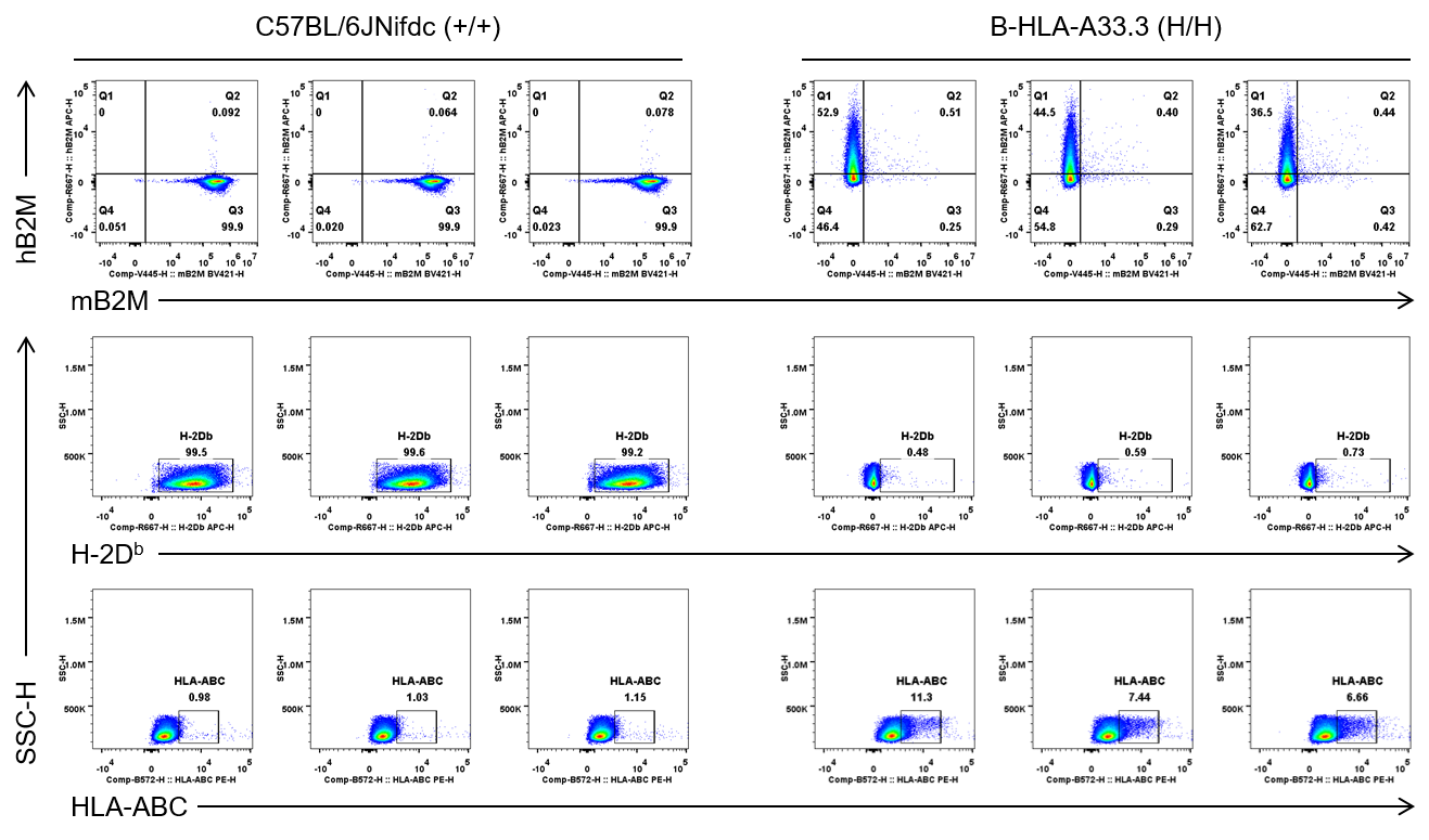 Strain specific B2M and HLA-A33.3 expression analysis in wild-type C57BL/6JNifdc mice and homozygous humanized B-HLA-A33.3 mice by flow cytometry. Splenocytes were collected from wild-type C57BL/6JNifdc mice (+/+) and homozygous B-HLA-A33.3 mice (H/H), respectively, and analyzed by flow cytometry with species-specific anti-HLA-A33.3 antibody (Biolegend, 311406), anti-H-2Db antibody (Biolegend, 111513), anti-hB2M antibody (Biolegend, 395712), and anti-mB2M antibody (BD Biosciences, 744802) antibody. HLA-A33.3 and human B2M were exclusively detectable in homozygous B-HLA-A33.3 mice.