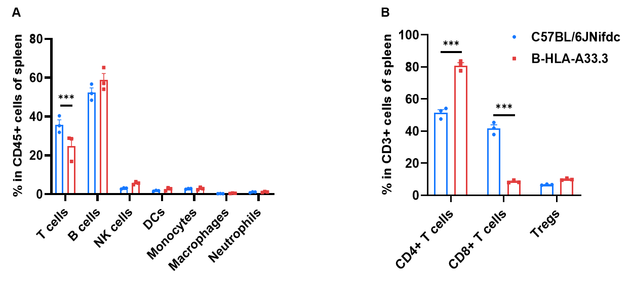 Frequency of leukocyte subpopulations in spleen by flow cytometry. Splenocytes were isolated from wild-type C57BL/6JNifdc mice and homozygous B-HLA-A33.3 mice (female,7-week-old, n=3). A. Flow cytometry analysis of the splenocytes was performed to assess the frequency of leukocyte subpopulations. B. Frequency of T cell subpopulations. Frequencies of NK cells, dendritic cells, monocytes, macrophages, neutrophils and Tregs in B-HLA-A33.3 mice were similar to those in C57BL/6JNifdc mice. Frequency of T cells in B-HLA-A33.3 mice were lower than in C57BL/6JNifdc mice. Frequency of CD8+ T cells in B-HLA-A33.3 mice were lower than in C57BL/6JNifdc mice, whereas the frequency of CD4+ T cells in B-HLA-A33.3 mice were higher than in C57BL/6JNifdc mice. Values are expressed as mean ± SEM. Significance was determined by two-way ANOVA test.  *P < 0.05, **P < 0.01, ***p < 0.001.