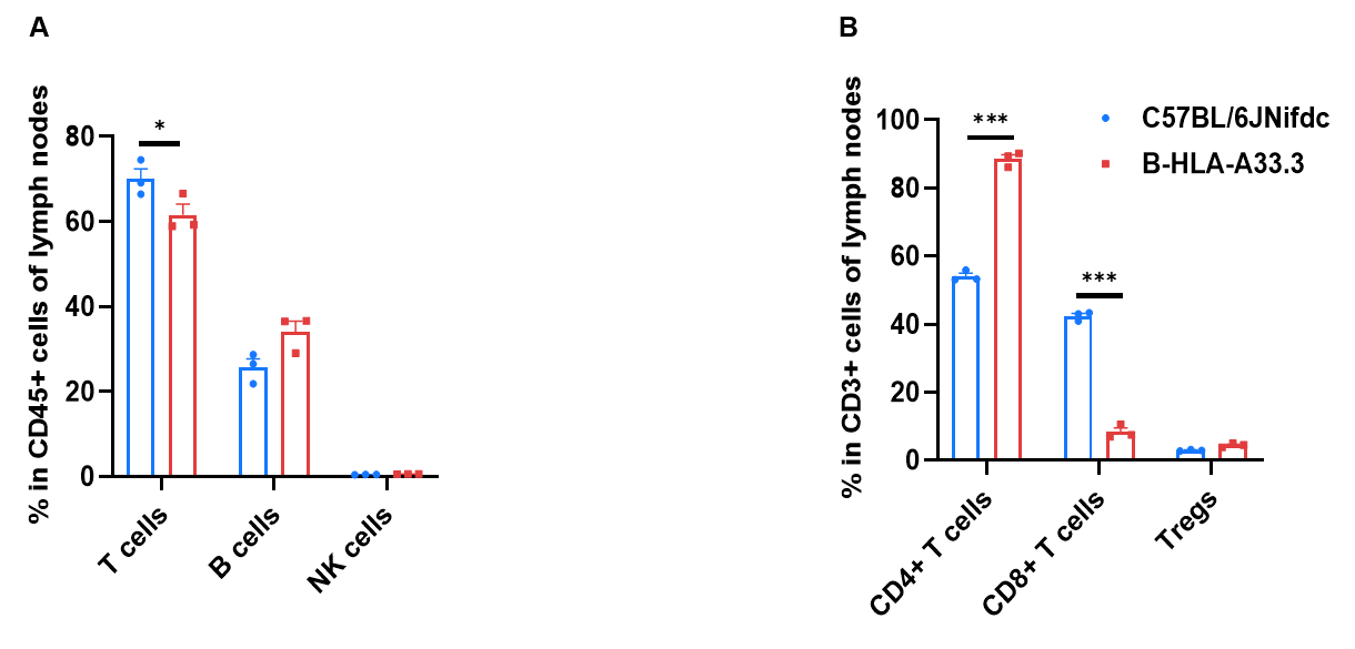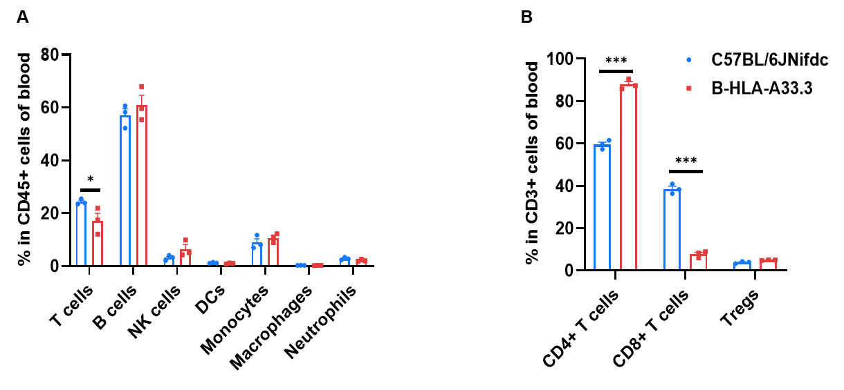 Frequency of leukocyte subpopulations in blood by flow cytometry. Blood were isolated from wild-type C57BL/6JNifdc mice and homozygous B-HLA-A33.3 mice (female,7-week-old, n=3). A. Flow cytometry analysis of the blood was performed to assess the frequency of leukocyte subpopulations. B. Frequency of T cell subpopulations. Frequencies of NK cells, dendritic cells, monocytes, macrophages, neutrophils and Tregs in B-HLA-A33.3 mice were similar to those in C57BL/6JNifdc mice. Frequency of T cells in B-HLA-A33.3 mice were lower than in C57BL/6JNifdc mice. Frequency of CD8+ T cells in B-HLA-A33.3 mice were lower than in C57BL/6JNifdc mice, whereas the frequency of CD4+ T cells in B-HLA-A33.3 mice were higher than in C57BL/6JNifdc mice. Values are expressed as mean ± SEM. Significance was determined by two-way ANOVA test.  *P < 0.05, **P < 0.01, ***p < 0.001.