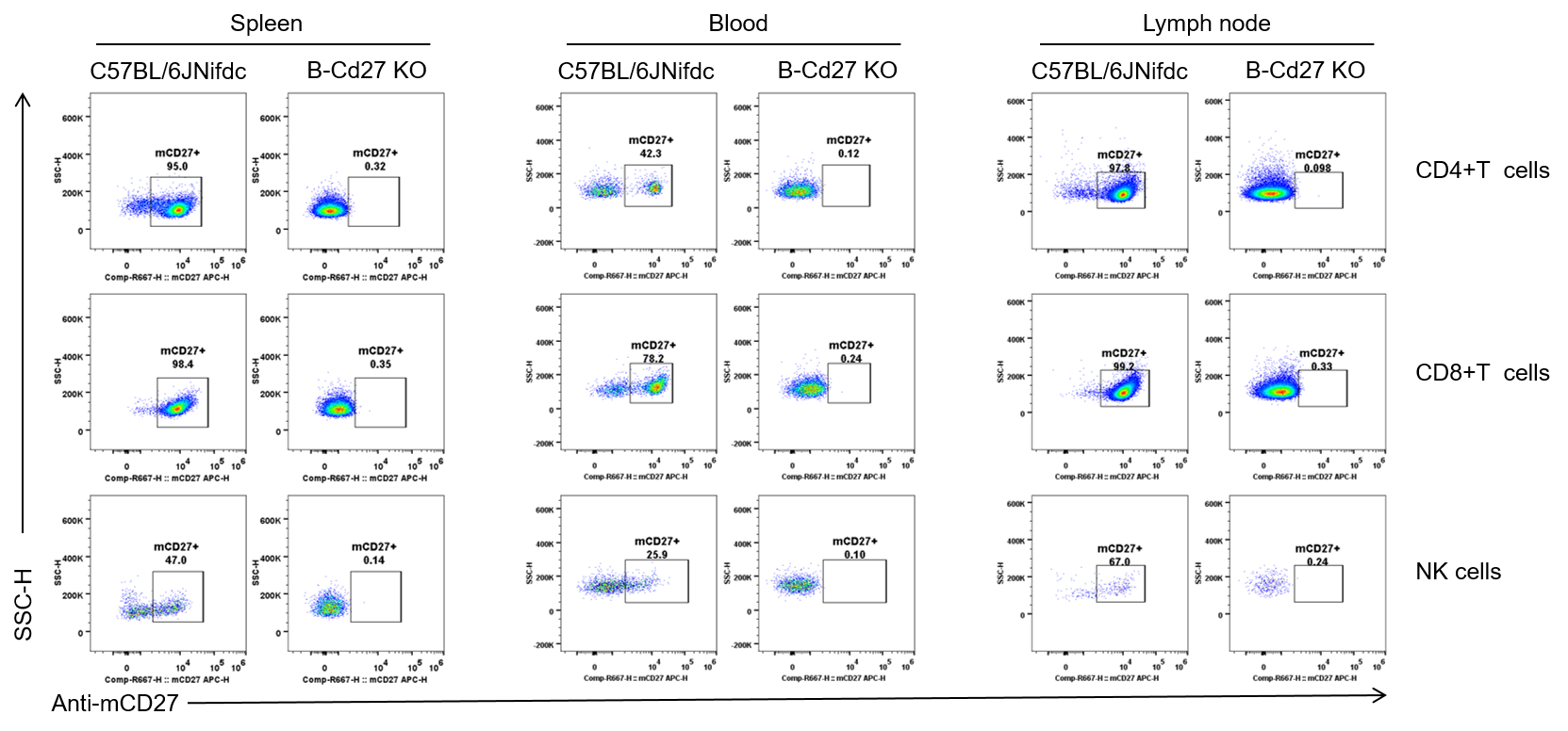 - Mouse CD27 was only detectable in T cells and NK cells of wild-type C57BL/6JNifdc mice, but not in B-Cd27 KO mice.