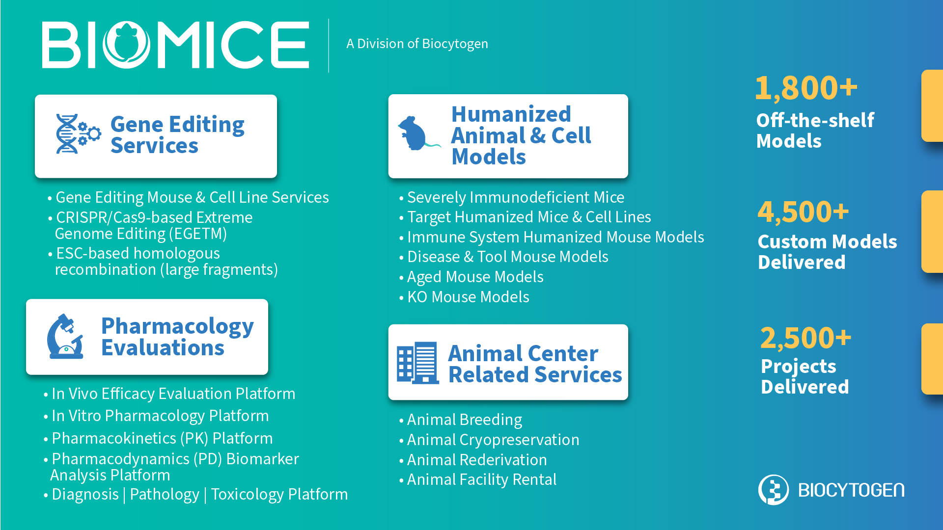 Biocytogen’s sub-brand BioMice provides preclinical contract research services and products, including gene editing services, animal model development and sales, and preclinical pharmacology evaluation services. Our innovative animal models have been sold to more than 20 countries and regions around the world, and we have offered more than 2,000 preclinical pharmacology and efficacy evaluation services for over 400 clients globally.