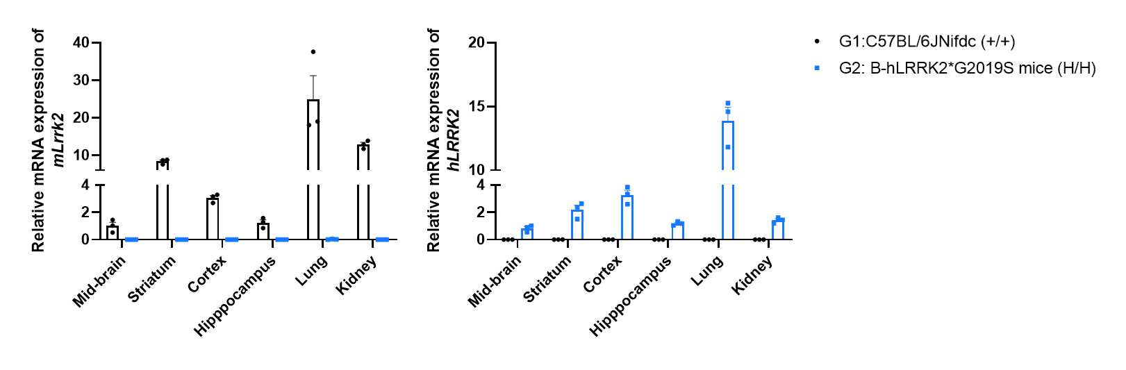 Strain specific analysis of LRRK2 mRNA expression in wild-type C57BL/6JNifdc mice and B-hLRRK2*G2019S by RT-PCR. Striatum, mid-brain, cortex, hippocampus, lung and kidney RNA were isolated from wild-type C57BL/6JNifdc mice (+/+) and homozygous B-hLRRK2*G2019S mice (H/H, male, 12-week-old), then cDNA libraries were synthesized by reverse transcription, followed by RT-qPCR with mouse or human LRRK2 primers. Mouse Lrrk2 mRNA was only detectable in wild-type mice, human LRRK2 mRNA was exclusively detectable in homozygous B-hLRRK2*G2019S mice but not in wild-type mice. Mouse Gapdh served as an internal reference gene, and LRRK2 expression in other tissues was normalized to that in the mid-brain.