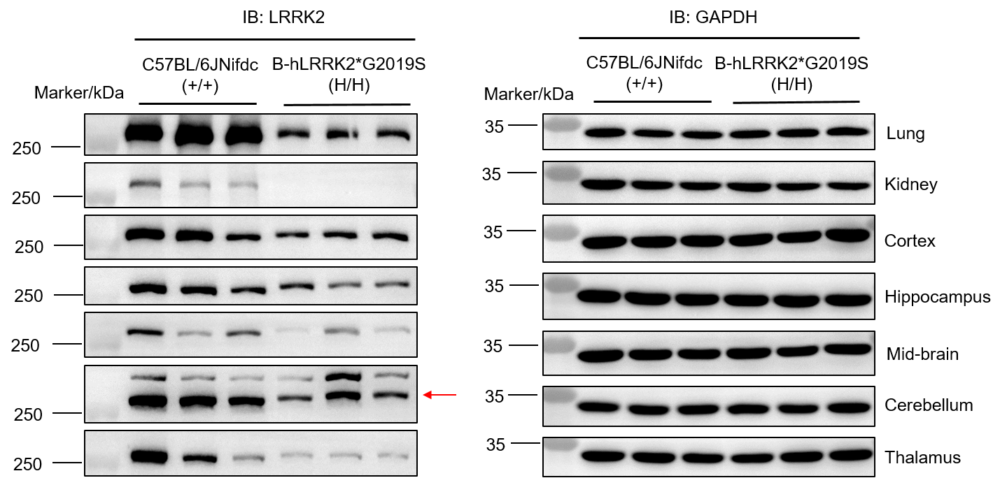 • Human LRRK2 mRNA was only detectable in brain from homozygous B-hLRRK2*G2019S mice, and the point mutation was confirmed via Sanger Sequencing. LRRK2 protein were detectable in cortex, hippocampus, mid-brain, thalamus and cerebellum from homozygous B-hLRRK2*G2019S mice. The antibody used showed cross-react with both human and mouse proteins.