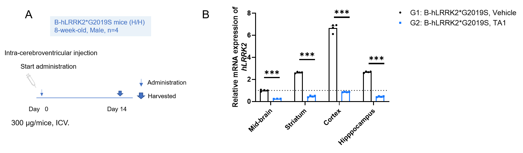 The inhibitory efficiency of the LRRK2-targeted small nucleic acid drug in homozygous B-hLRRK2*G2019S mice. B-hLRRK2*G2019S mice were randomly divided into 2 groups (n=4, 8-week-old, male). The human LRRK2-targeted nucleic acid drug (Test Article 1, TA1, produced in-house according to a patent) and artificial cerebrospinal fluid (αCSF) were administered to the mice individually. The mice were sacrificed on day 14, and the brains (cortex, hippocampus, mid-brain and striatum) were collected to detect the human LRRK2 expression by qRT-PCR. (A) The schematic diagram of experimental processing. (B) The expression of human LRRK2 mRNA in cortex, hippocampus, mid-brain and striatum. Gapdh served as an internal reference gene, and LRRK2 expression in other tissues was normalized to that in the mid-brain. The human LRRK2 mRNA in the treatment group was significantly reduced compared to the control group. Values are expressed as mean ± SEM. Significance was determined by 2-way ANOVA.  *P < 0.05, **P < 0.01, ***P < 0.001.