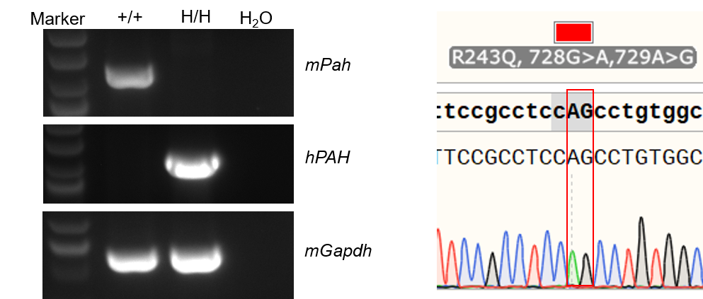 Strain specific analysis of PAH mRNA expression in wild-type C57BL/6JNifdc mice and B-hPAH*R243Q mice by RT-PCR. Liver RNA were isolated from wild-type C57BL/6JNifdc mice (+/+) and homozygous B-hPAH*R243Q mice (H/H), then cDNA libraries were synthesized by reverse transcription, followed by PCR with mouse or human PAH primers. Mouse Pah mRNA was only detectable in wild-type mice. Human PAH mRNA was exclusively detectable in homozygous B-hPAH*R243Q mice. Point mutations in homozygous B-hPAH*R243Q mice were confirmed via Sanger Sequencing.
