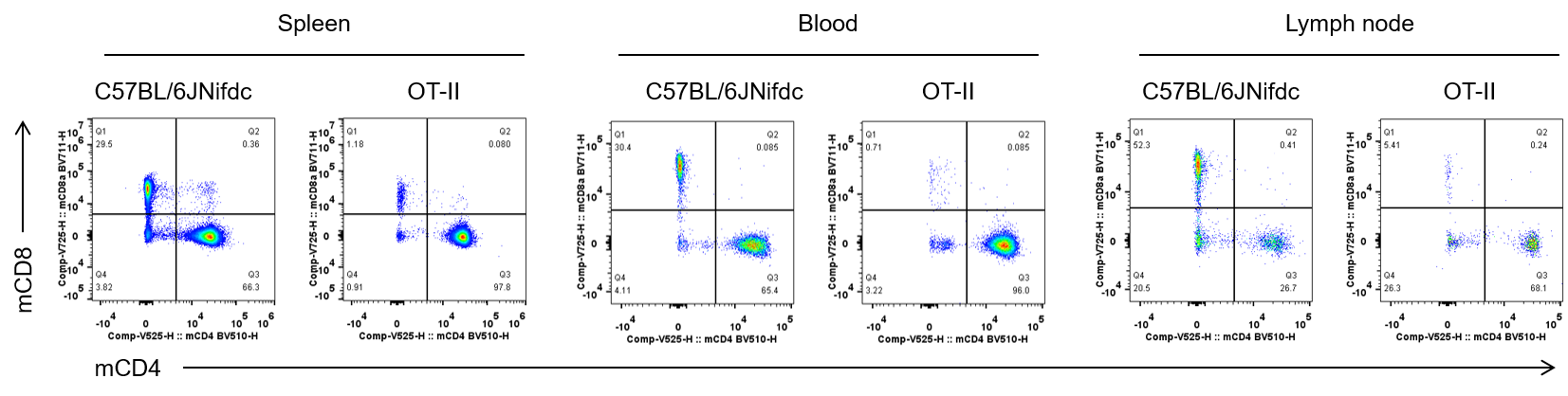 The CD4+/CD8 ratio between wild-type C57BL/6JNifdc mice and homozygous OT-II mice. Splenocytes, blood and lymph nodes were collected from wild-type C57BL/6JNifdc mice and homozygous OT-II mice (Male, 7-week old). OT-II mice exhibit a significant shift in their T cell population, with increasing in the CD4+/CD8+ T cell ratio compared to wild-type mice.