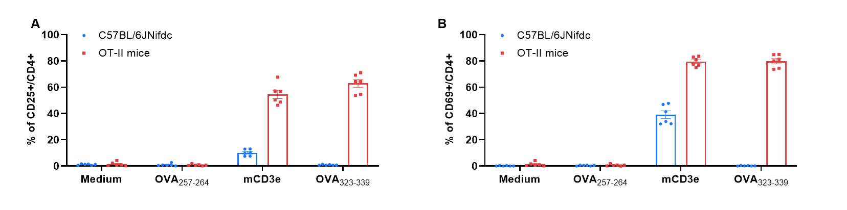 Antigen-specific activation increases surface CD25 and CD69 expression of OT-II CD4+ T cells. Splenocytes from wild-type C57BL/6JNifdc mice and homozygous OT-II mice were exposed for 24h to OVA323-339. In parallel, medium and OVA257-264 (10 µg/mL) were included as negative controls. And anti-mCD3e mAb were included positive controls. Percentage of CD25+ (A) and CD69+ (B) gated CD4+ T-cells were assessed by flow cytometry. Flow cytometry analyses of OVA323–339 challenged CD4+ T cells from OT-II mice showed higher surface expression levels of the early T cell activation markers CD69 and CD25. Data are mean ± SEM values.