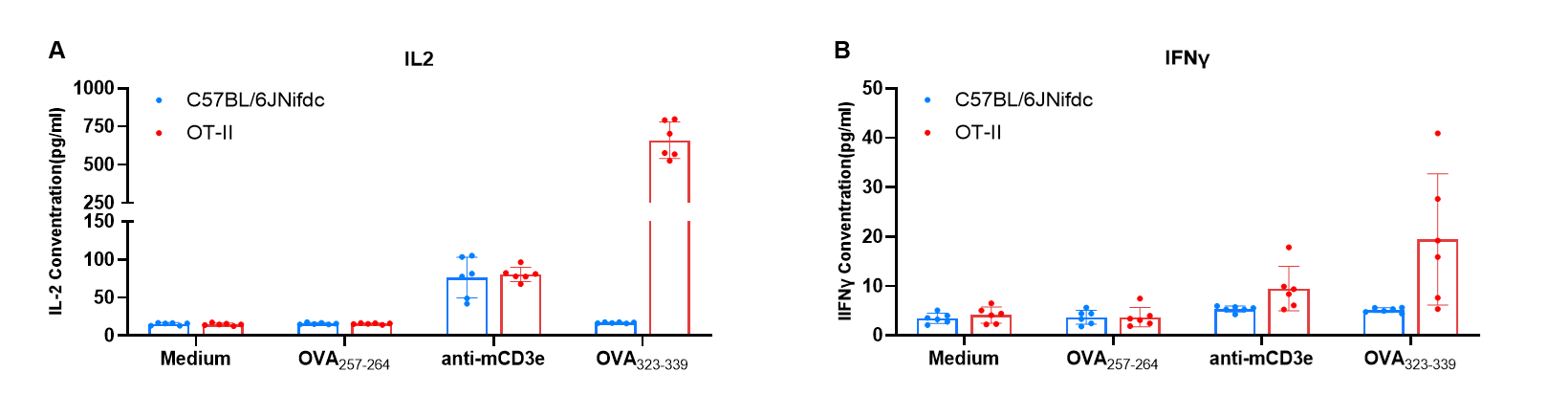 Antigen-specific activation increases IL-2 but not IFN-γ expression of OT-II splenocytes. (A) Culture supernatants from wild-type C57BL/6JNifdc mice, homozygous OT-II mice (Biocytogen splenocytes stimulated for 24h with medium, OVA257-264 (10 µg/mL), anti-mCD3e mAb (0.5 mg/mL) or OVA323-339 (10 µg/mL) were assayed for IL-2 and IFN-γ levels by ELISA. ELISA analysis of culture supernatants from OVA323-339-challenged (10 µg/mL) OT-II mice splenocytes for 24h revealed increased levels of IL-2. Data are mean ± SEM values.