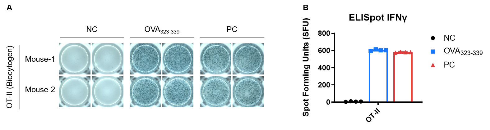 Detection of OVA-induced immune responses in OT-II mice by IFN-γ ELISpot assay. Female OT-II mice from the Biocytogen were immunized with intraperitoneal injection of 0.5 mg of OVA protein (Simga, A5503-25MG) and 50 μg poly (I:C) (InvivoGen, tlrl-pic). Three weeks after the last immunization, mice were sacrificed. Mice were immunized with OVA two times at 1-week interval. One week after the last immunization, mice were sacrificed. The splenocytes were extracted, stimulated with OVA323-339, or no peptide as negative control (NC), or Cell Activation Cocktail (without Brefeldin A), (Biolegend, 42330) as positive control, and then measured for IFN-γ secretion. No significant difference in body weight among groups (Data was not shown). (A) Representative results showing stimulation of splenocytes harvested from immunized mice with negative control, or OVA323-339, or positive control in duplicates. (B) Summary of results. These data indicate that OT-II mice have specific response to the OVA323-339.
